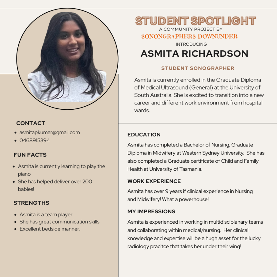 A community project by Sonographers Downunder.  We help enrolled students looking for a traineeship by picking one student per month to feature their profile on our LinkedIn Page and Socials.  Join Sonographers Downunder Facebook Group and write a post introducing yourself and include the phrase 'I'd love the chance to feature on Student Spotlight'.